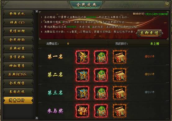 活动说明:活动期间,消费达到300000钻石的玩家参与排行,排名前三的玩家可技能书随机箱、神魔装备随机箱奖励,奖励在活动结束后以邮件的方式进行发放