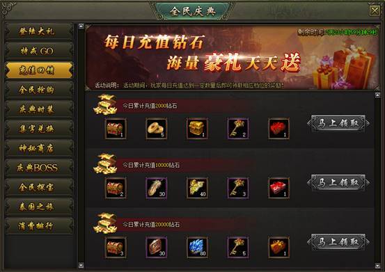 活动说明:活动期间,每日充值达到指定额度,即可领取超值豪礼,每种档位可领取1次