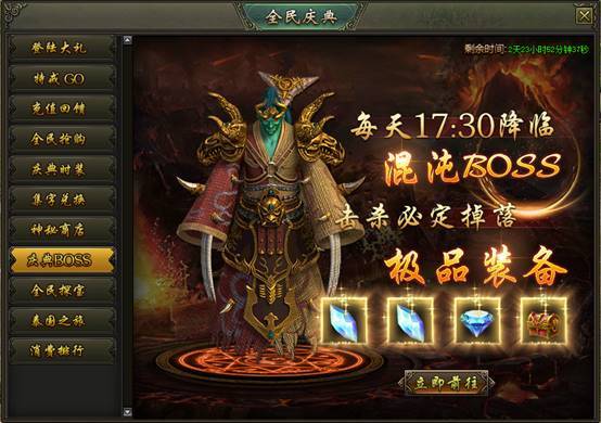 活动说明:活动期间,每天18:00混沌魔殿入口限时开启,全服玩家合力击败2大混沌BOSS,有机会获得海量元宝、钻石、稀有材料及高级装备奖励