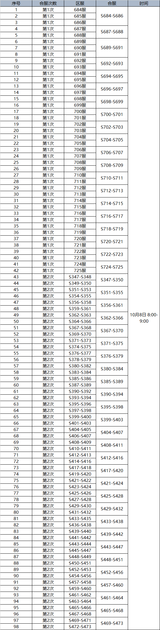 为了给您提供更好的游戏体验和感受,我们将在2019年10月7日对部分服务器进行合服操作,合服时间会因为数据量大小提前或延迟。服务器合服后,原服务器入口依然保留,参与合服的玩家依然可以选择老的服务器名进行进入。