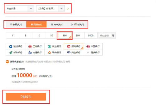 第一步:点击“立即充值”按钮,跳转至充值页面,选择游戏“热血战歌”及区服,点击下方“100”面值,选择支付方式后点击“立即支付”;