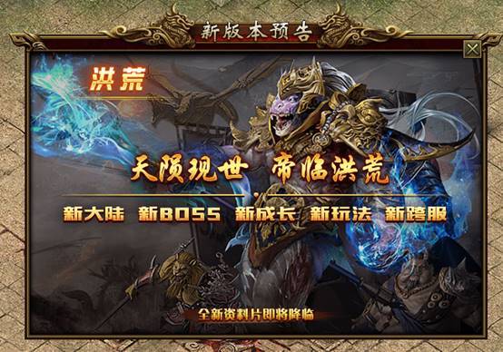 大型资料片“洪荒”即将更新,海量新内容来袭!新大陆“洪荒古地”、洪荒BOSS深渊系列地图、荒古秘境等你探索,更强的洪荒BOSS、鸿蒙BOSS、世界BOSS、团队BOSS带来全新挑战,新成长魔地征服、征服勋章、装备融合、新装备助你战力再度飙升,全新30VS30全服跨服战场燃爆寒冬!