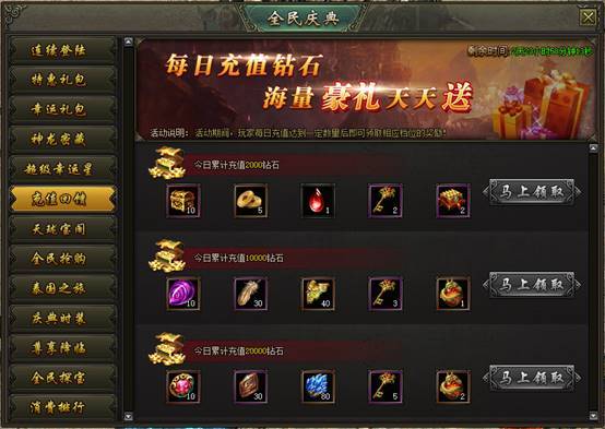 活动说明:活动期间,玩家每日充值达到一定数量后即可领取相应档位的奖励!