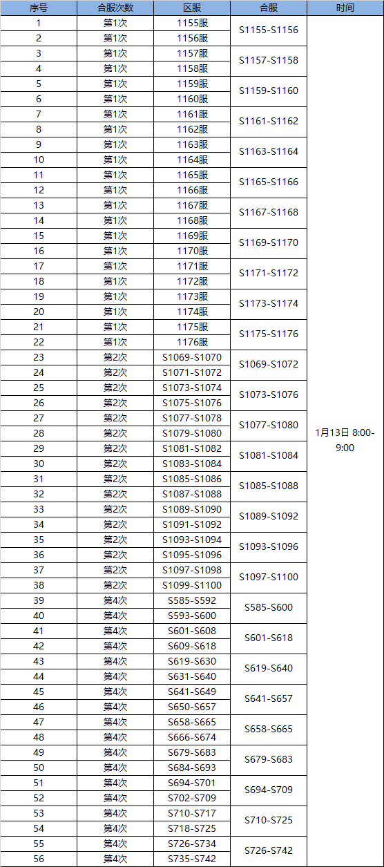 为了给您提供更好的游戏体验和感受,我们将在2020年1月13日对部分服务器进行合服操作,合服时间会因为数据量大小提前或延迟。服务器合服后,原服务器入口依然保留,参与合服的玩家依然可以选择老的服务器名进行进入。