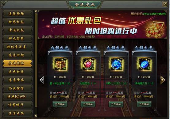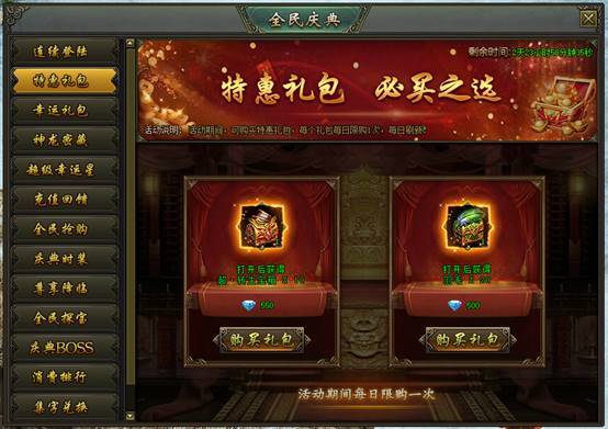活动说明:活动期间,可购买特惠礼包,每个礼包每日限购1次,每日刷新!