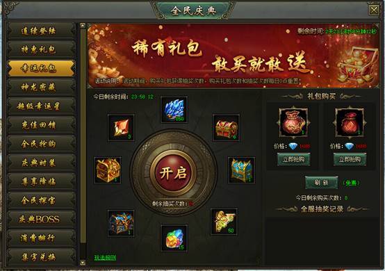 活动说明:活动期间,购买礼包获得抽奖次数,购买礼包次数和抽奖次数每日0点重置。