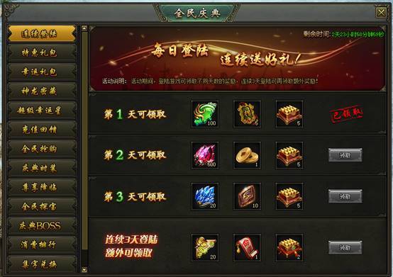 活动说明:活动期间,登陆游戏可领取不同天数的奖励,连续3天登陆可再领取额外奖励