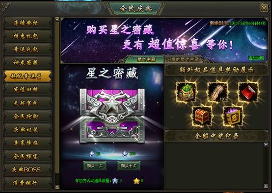 活动说明:活动期间,玩家可使用幸运星开启星之密藏获得随机奖励,开始密藏时有几率获得2倍奖励,更有机会额外获得极品道具奖励