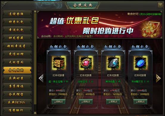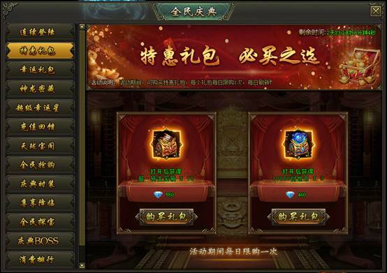 活动说明:活动期间,可购买特惠礼包,每个礼包每日限购1次,每日刷新!