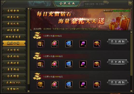 活动说明:活动期间,玩家每日充值达到一定数量后即可领取相应档位奖励!