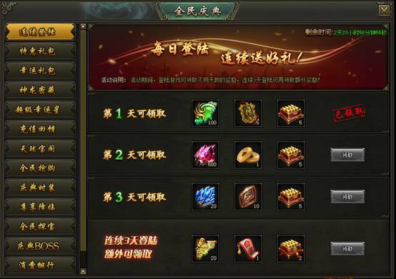活动说明:活动期间,登陆游戏可领取不同天数的奖励,连续3天登陆可再领取额外奖励