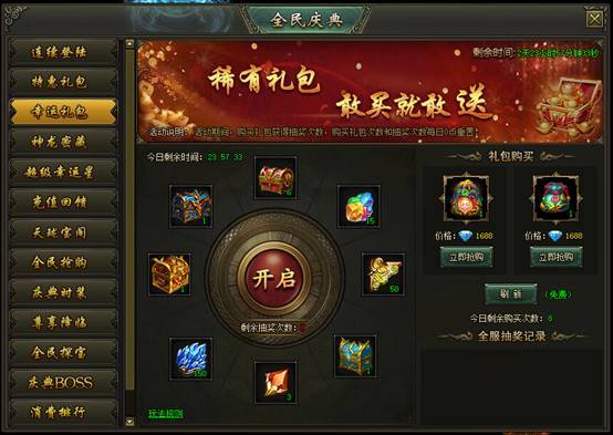 活动说明:活动期间,购买礼包获得抽奖次数,购买礼包次数和抽奖次数每日0点重置。
