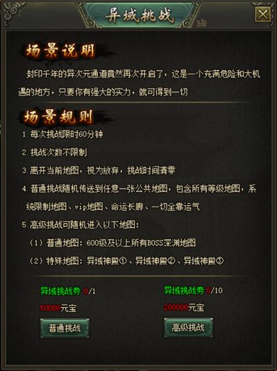 (2)高级挑战参与条件:600级以上玩家,每次消耗异域挑战券x10、元宝20万