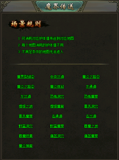 (1)魔界裂缝①入口处新增NPC“魔界传送”,可消耗护体值传送至任意当前可进入的裂缝地图,根据距离,不同地图消耗不同