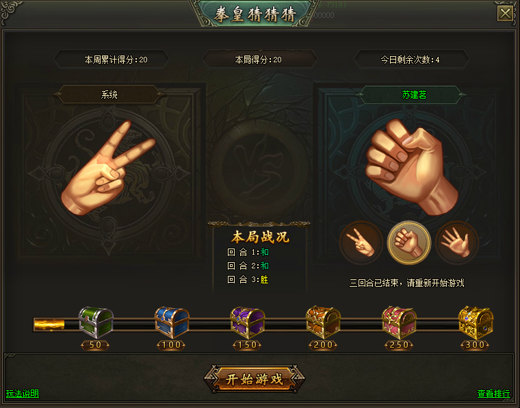 (2)每天可参与5局,每局分为3个回合,可点击界面“开始游戏”开始本局游戏