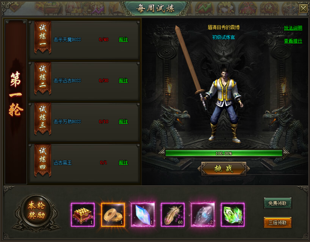 (6)战胜当轮试炼官后,可领取当轮奖励,奖励可免费或三倍领取