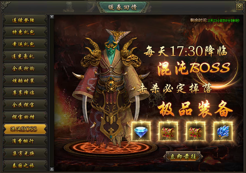 活动说明:活动期间,每天17:30降临混沌BOSS,击杀必定掉落极品装备