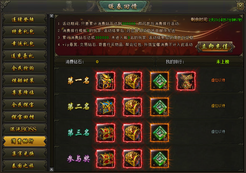 活动说明:活动期间,累计消费达到300000钻石的玩家参与排行,排名前三的玩家可获得珍贵装备、稀有道具等奖励,奖励在活动结束后以邮件的方式进行发放