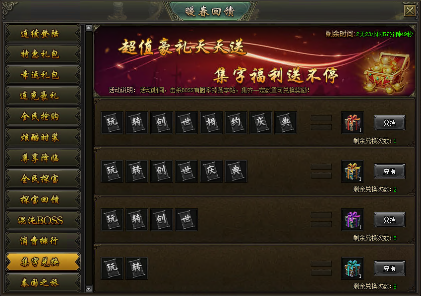 活动说明:活动期间,击杀boss有概率掉落字帖,集齐一定数量可兑换奖励