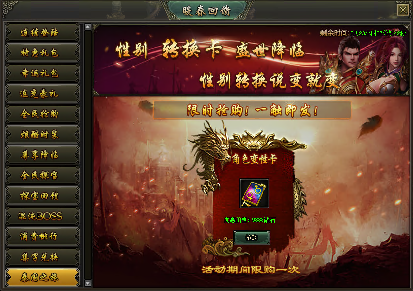 活动说明:活动期间,购买角色变性卡,可转换角色的性别