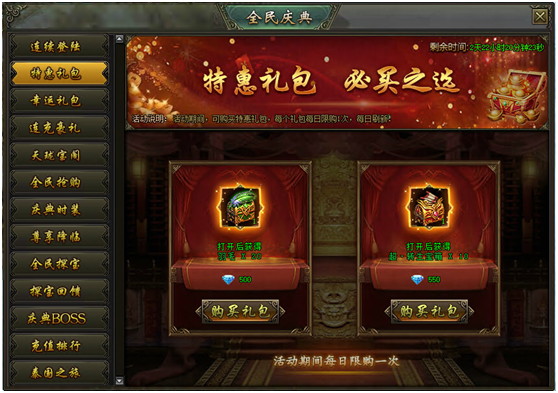 活动说明:活动期间,可购买特惠礼包,每个礼包每日限购1次,每日刷新!