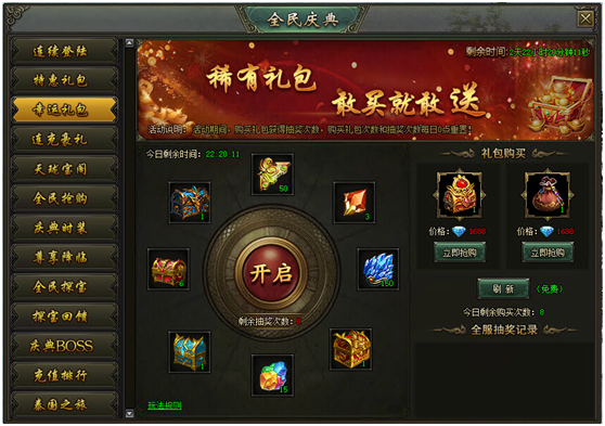 活动说明:活动期间,购买礼包获得抽奖次数,购买礼包次数和抽奖次数每日0点重置。