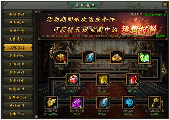 活动说明:活动期间,达成天珑宝阁中的条件,即可依次领取对应奖励