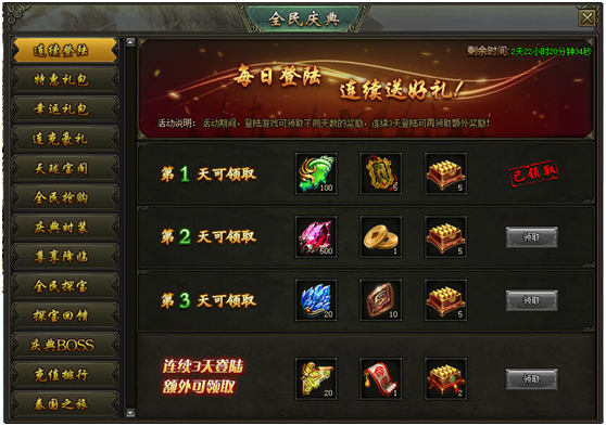 活动说明:活动期间,登陆游戏可领取不同天数的奖励,连续3天登陆可再领取额外奖励