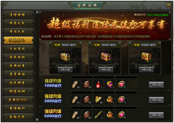 活动说明:活动期间,每天累计充值到指定档位即可领取奖励,连续3天充值到指定档位即可领取超级奖励
