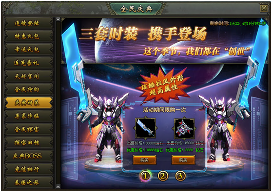 活动说明:活动期间,绝版时装限时出售,炫酷拉风外型、超高属性都在这里!