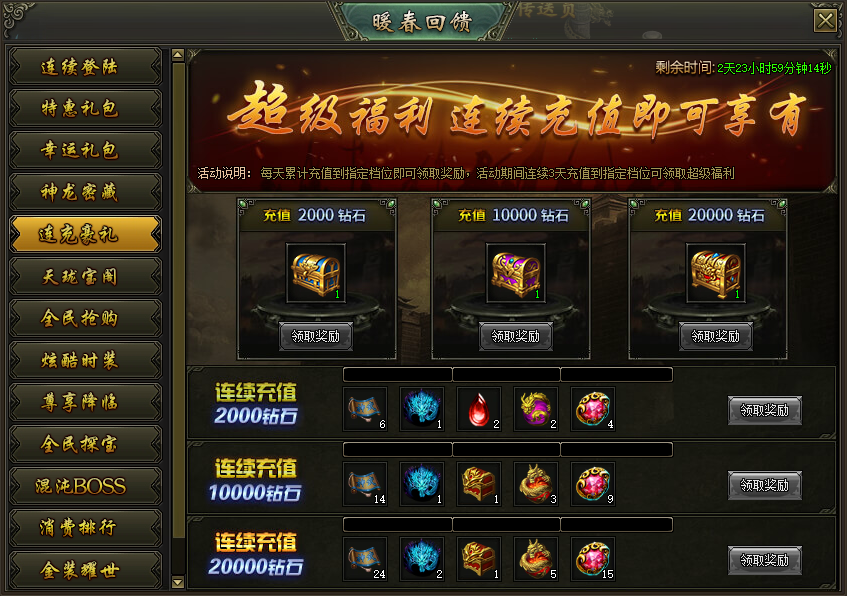 活动说明:活动期间,每天累计充值到指定档位即可领取奖励,连续3天充值到指定档位即可领取超级奖励