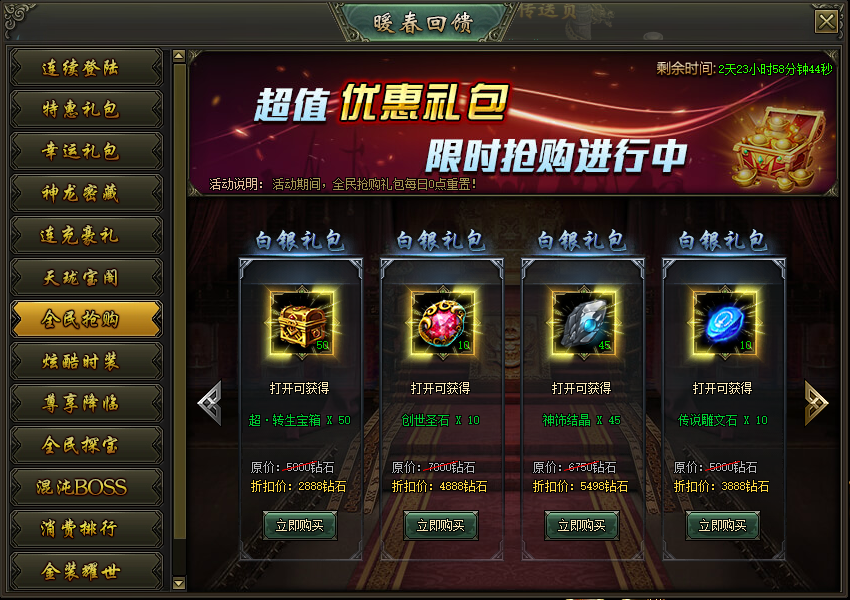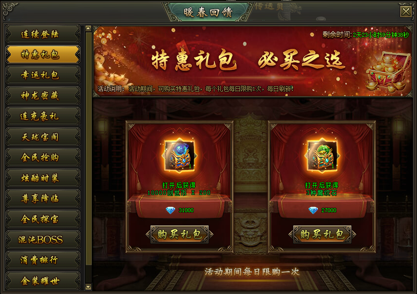 活动说明:活动期间,可购买特惠礼包,每个礼包每日限购1次,每日刷新!