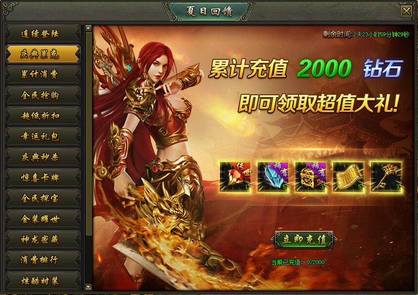 活动说明:活动期间,累计充值到指定档位即可领取大量奖励