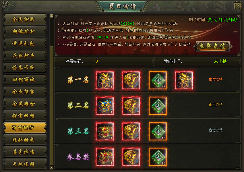 活动说明:活动期间,累计消费达到100000钻石的玩家参与排行,根据消费的钻石数可以获得各个档位的珍贵装备、稀有道具等奖励,奖励在活动结束后以邮件的方式进行发放