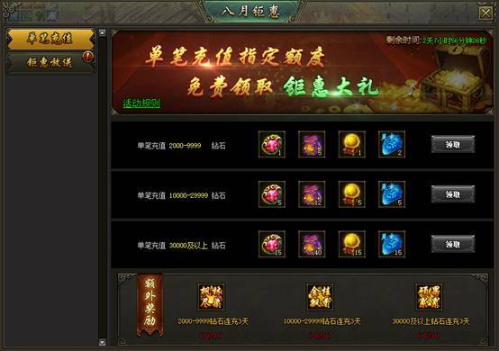 (2)活动一单笔充值:活动期间单笔充值指定金额可领取大量奖励,连续充值3天可额外获得绝版称号