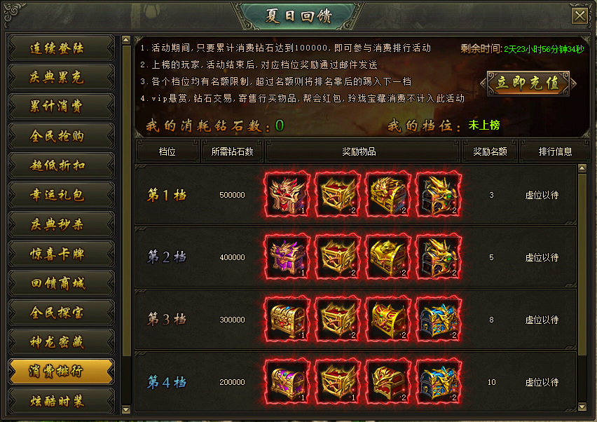 活动说明:活动期间,累计消费达到100000钻石的玩家参与排行,根据消费的钻石数可以获得各个档位的珍贵装备、稀有道具等奖励,奖励在活动结束后以邮件的方式进行发放