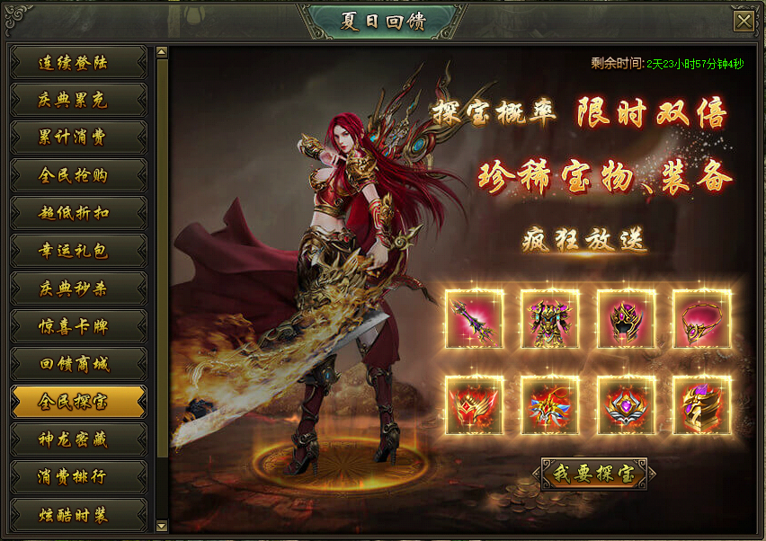 活动说明:活动期间,龙之宝藏产出圣装的概率限时翻倍,极品圣装、珍稀宝物大放送!