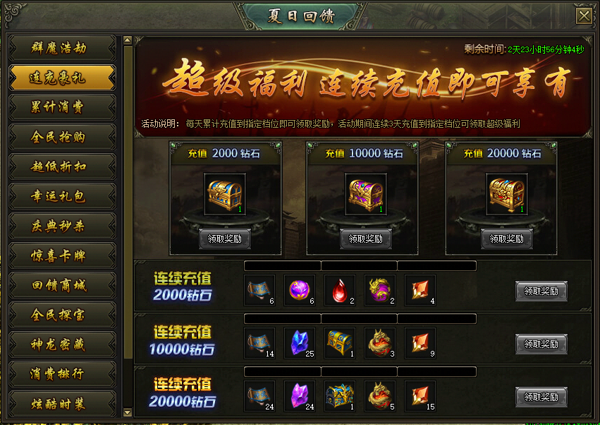 活动说明:活动期间,每天累计充值到指定档位即可领取对应奖励,连续充值3天可领取连充大奖