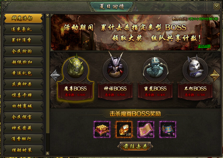 活动说明:活动期间,累计击杀指定类型BOSS,可领取超值奖励